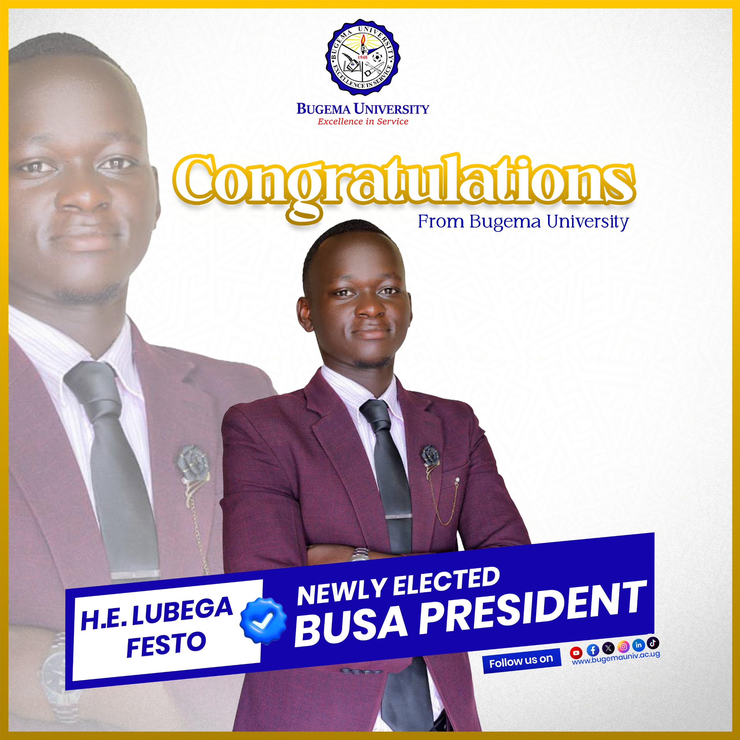 Big Win: H.E. Lubega Festo Chosen as BUSA President for 2026–2027After voting ended and counting was done quickly, Bugema University shared the results with great joy. H.E. Lubega Festo won and became the new BUSA President for the 2026–2027 term. In an official message posted on the university’s Facebook and Instagram pages, the leaders said: “We are thrilled to announce that H.E. Lubega Festo has been officially elected as the new BUSA President of Bugema University. With a vision for excellence and a commitment to service, we look forward to the leadership and positive impact he will bring to our student body. Congratulations, Mr. President!” Lubega Festo is known for his strong support for students and his close ties with the student group. He campaigned with ideas about putting students first, good academic work, full personal growth, and staying true to the university’s values of honesty and service. His team created a special vibe on campus with energetic events that made many students excited and ready to support him.